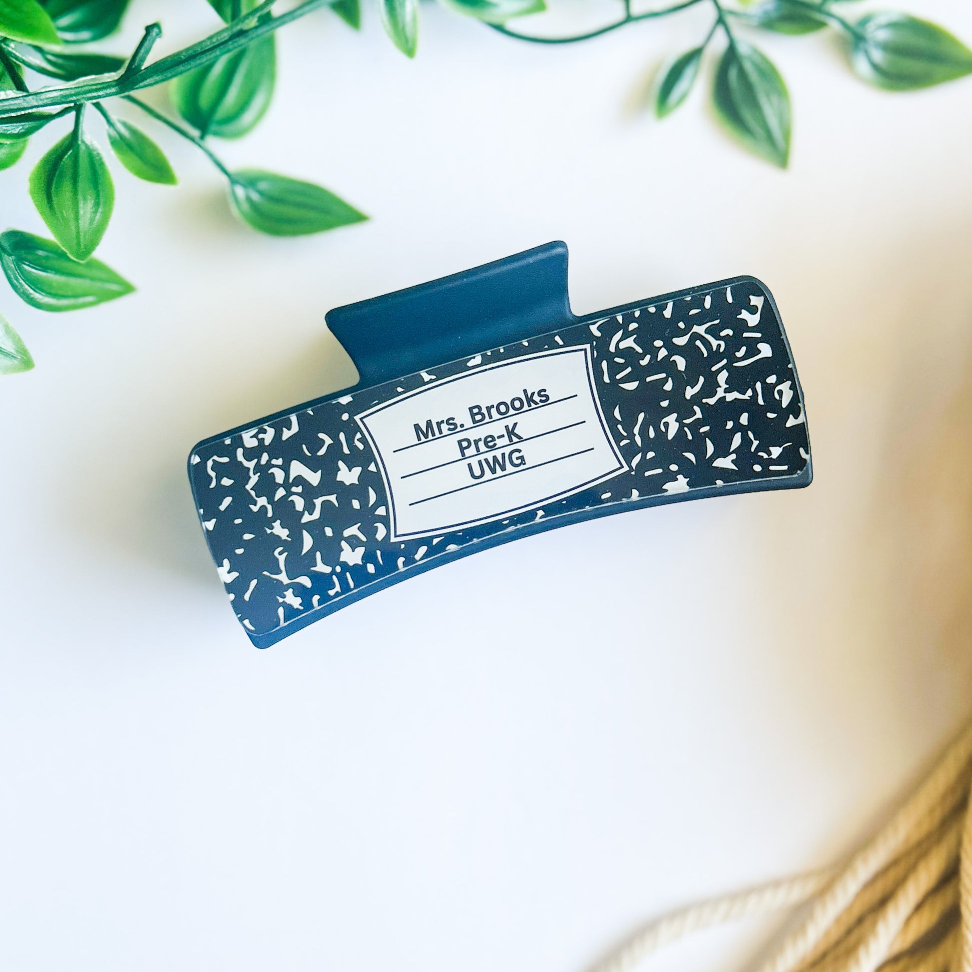 The design is placed onto acrylic and then glued down to the claw clip. You can choose for both sides to say the same name or change it so one side has the teacher's name and the other side has the school name, grade level, etc.
